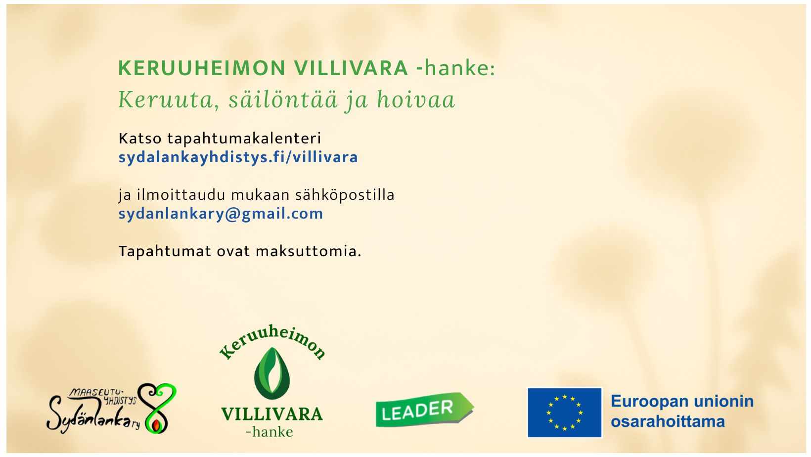 KERUUHEIMON VILLIVARA on kasvukaudella 2025 toteutettava MiniLeader-kehittämishanke, jonka tavoitteena on lisätä luonnontuotteiden – kuten villivihannesten, -yrttien sekä luonnon hoivatuotteiden (esim. saunavastat ja salvat) – keruun, käsittelyn ja säilönnän osaamista sekä kehittää yhteisölähtöistä keruukulttuuria Pohjois-Karjalassa.